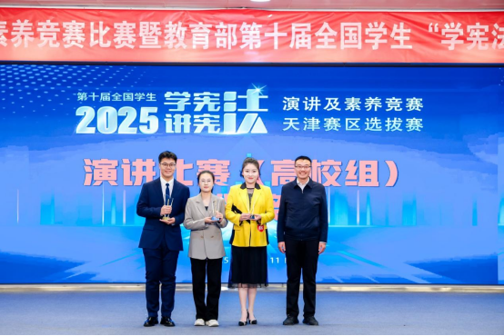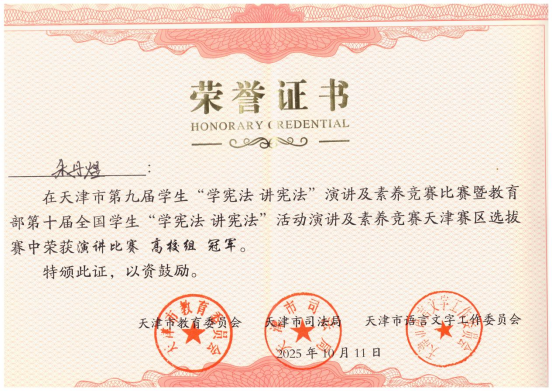 由天津市教育委员会、天津市司法局、天津市语言文字工作委员会联合主办的第十届全国学生学宪法、讲宪法演讲及素养竞赛天津赛区选拔赛于10月11日圆满收官。2023级政治学与行政学专业本科生朱丹煜从全市各高校优秀选手中脱颖而出,荣获高校组冠军。