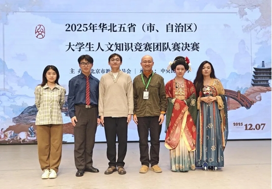 本次大赛以“观乎人文,化成天下”为主题,涵盖文学、历史、哲学、艺术等领域,包括百科知识笔试、经史论议、格律诗创作、人文知识问答、人文演绎表演等环节。团队赛总决赛共有来自北京市、天津市、河北省、山西省、内蒙古自治区的10支队伍参赛。由马小媛及文学院闫乐、陈奕衡、王亚鹏、张丰舟五名同学组成的“月圆蓬舟横”团队在比赛中将经典读活、把文化演透,充分展现出新时代青年自觉赓续中华文脉的担当作为。最终,他们凭借深厚的人文素养及出色的团队协作,荣获总决赛一等奖。