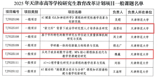 近日,天津市教委公布 2025 年天津市高等学校研究生教育改革计划项目立项结果,政治与行政学院高景柱教授和魏巍教授主持的两项课题成功获批一般项目立项,彰显学院在研究生教育改革与人才培养创新领域的扎实探索。