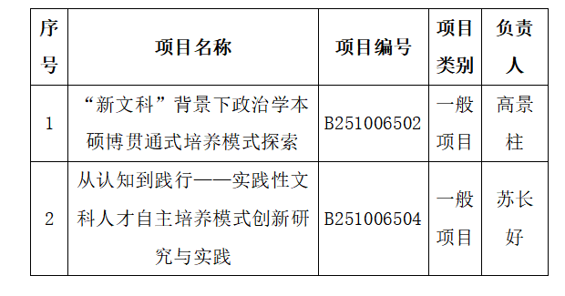 天津市教育委员会公布2025年天津市普通高等学校本科教学质量与教学改革研究计划项目立项结果,政治与行政学院高景柱老师主持的《“新文科”背景下政治学本硕博贯通式培养模式探索》、苏长好老师主持的《从认知到践行——实践性文科人才自主培养模式创新研究与实践》两项课题成功获批一般项目立项。